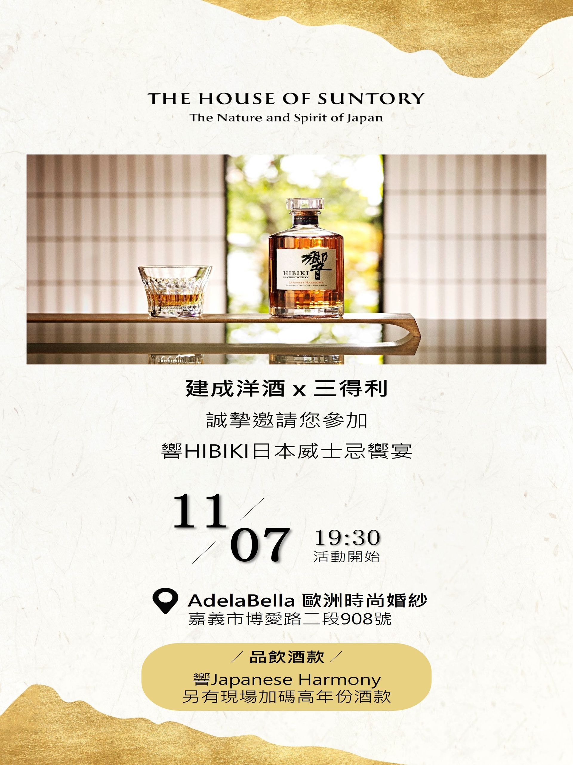 這週五(11/7)即將由《建成洋酒、AdelaBella歐洲時尚婚紗與三得利 》共同舉「響 Hibiki 品酒會」